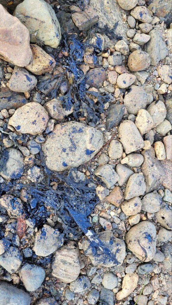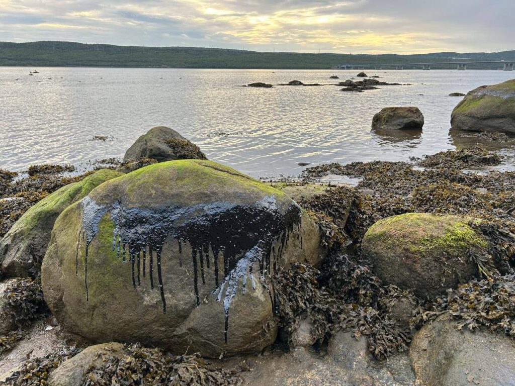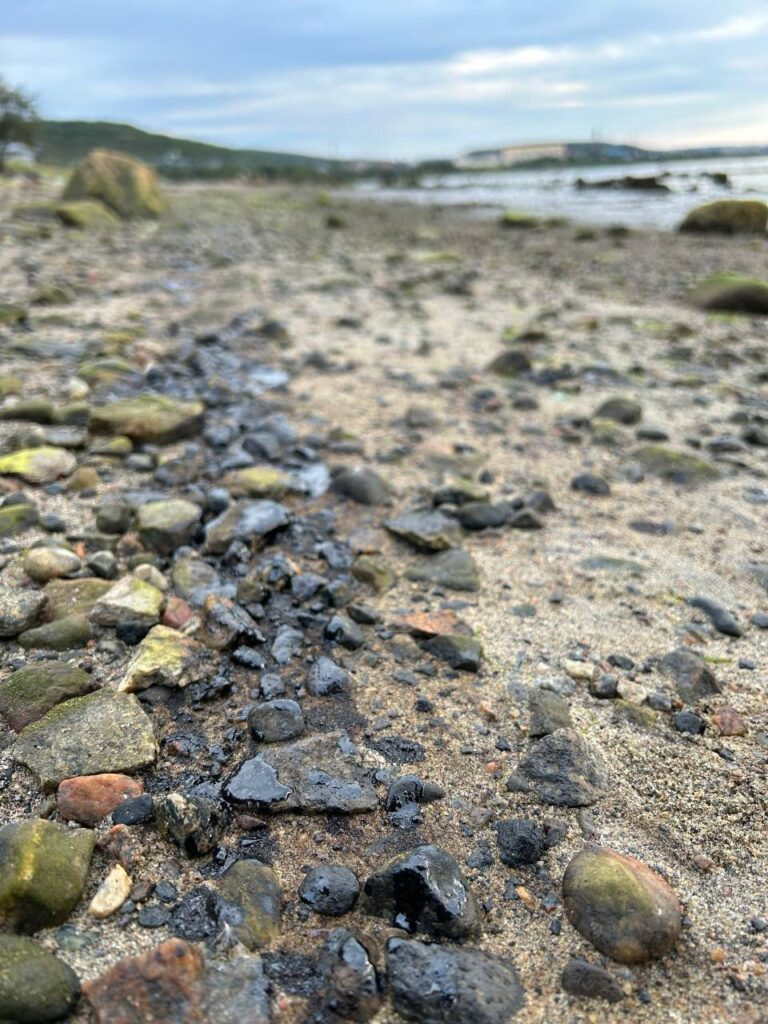 Местные жители и экологи выражают серьёзную обеспокоенность: камни в заливе покрыты густой чёрной плёнкой, берег усеян мазутом, а вода имеет характерный радужный оттенок, свидетельствующий о загрязнении. Особенно тревожна находка замазученных перьев морских птиц — это наглядный признак ущерба для дикой природы.